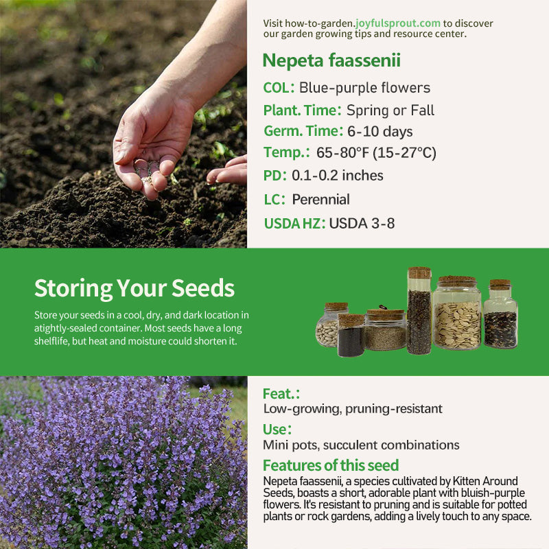 Nepeta faassenii "Cat Play" catnip seeds are a low-growing variety designed for small spaces and playful landscapes. Reaching just over a dozen centimeters tall, its sleek, rounded form resembles a small, green shrub, ensuring it stays put even in shallow pots. When in bloom, its small, vibrant bluish-purple flowers, dotted among the emerald green leaves, create a playful, childlike image of a group of cats playing in the grass. It's highly resistant to pruning and quickly sprouts new branches after pruning, making it suitable for miniature rock gardens or as a combination with succulents. Furthermore, it's highly adaptable to any environment, making it a cost-effective choice for both beginners and seasoned gardeners looking to create a fun landscape.