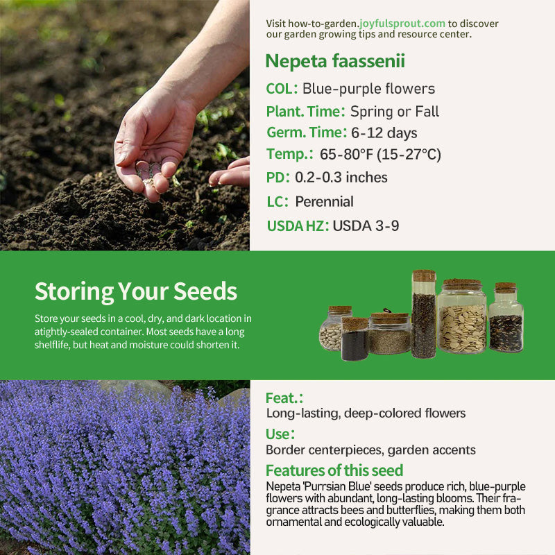 'Persian Blue' catnip seeds, with their rich blue-purple color and exceptionally long blooming period, are a prime choice for long-lasting garden viewing. This variety boasts an impressive profusion of flowers, beginning to form buds as soon as the spring weather warms, and continuing to bloom from early summer until just before frost in autumn, with a single plant boasting a flowering period of four to five months. Its flowers are a deep, yet not dull, blue-purple color. The spikes are full and compact, each one like a meticulously painted blue-purple brushstroke. When planted in large groups, they create magnificent blue-purple flower belts. Furthermore, its thick, disease-resistant leaves are highly susceptible to pests and diseases, and its soil requirements are moderate, allowing it to thrive in both sandy and garden soils. It can be used as a centerpiece in flower borders or as a cut flower for indoor decoration, offering both ornamental and practical value.