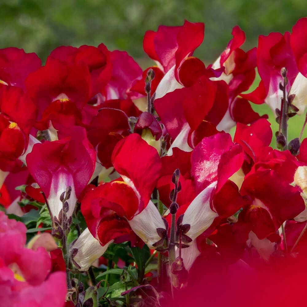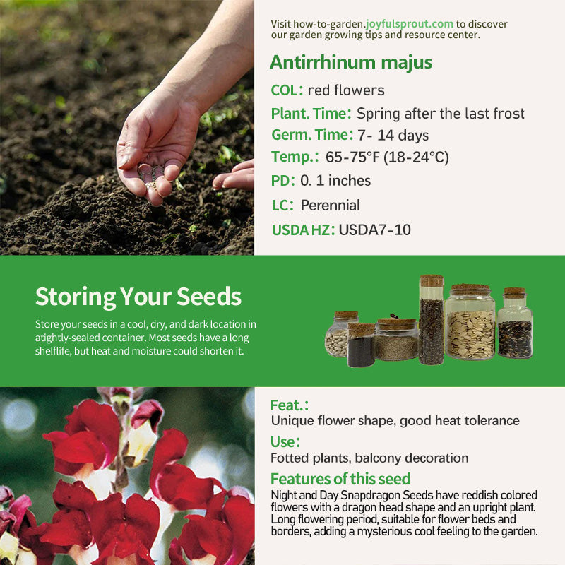 Night and Day Snapdragon Seeds grows plants with red flowers in the shape of a sprightly dragon head for a mysterious and cool look. Plants are about 24-30 inches tall, with upright stalks,narrow green leaves, and neatly ordered flower spikes. It blooms from late spring to early fall and is heat tolerant, blooming in the summer heat. Suitable for planting in the middle layer of the flower bed with silver, gray plants, highlighting the charm of the color clash, can also be potted in the balcony, for small space injection of individual style, simple maintenance, easy to produce results.