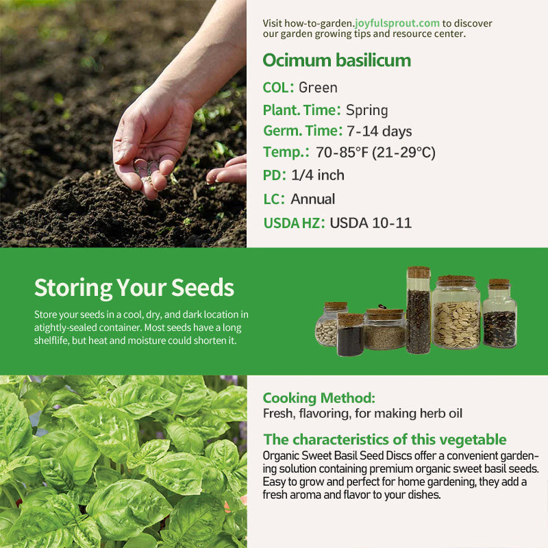 Organic Sweet Basil Seed Discs provide a convenient way to grow basil for home gardening. These seed discs contain high-quality organic sweet basil seeds, making it easy to grow fresh basil. Imagine simply placing the seed disc in the soil on a sunny day, waiting a few days, and harvesting fresh basil. Organic sweet basil is not only fragrant but also rich in vitamin K, vitamin A, and antioxidants, which help boost immunity and improve digestion. Whether used for seasoning, in salads, or as a garnish, it adds a unique flavor and healthy element to your dishes, allowing you to enjoy nature's bounty while savoring delicious food.