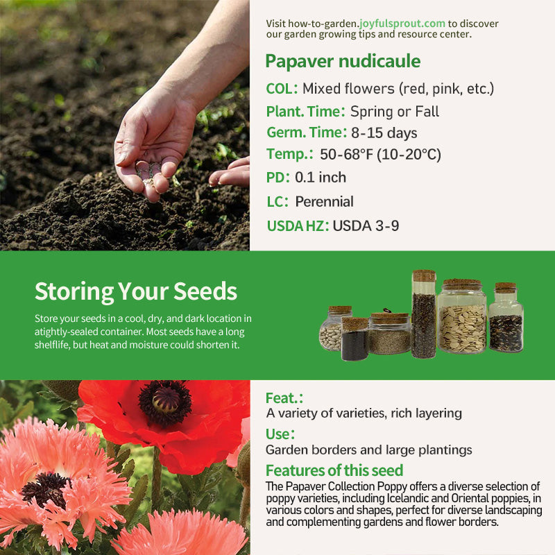 The Papaver Collection Poppy is a one-stop landscaping poppy set, featuring 3-5 varieties, including Icelandic, Oriental, and Poppies, to meet diverse aesthetic needs. The flower colors range from vibrant reds and pinks to softer tones. The different varieties vary slightly in height (12-30 inches), creating a natural "staggered" effect, allowing for a three-dimensional flower border without the need for artificial coordination. All varieties in the set are easy to care for, light-loving, and tolerant of poor soil. They can grow in standard garden soil and bloom from late spring to early summer. The staggered blooming of the different varieties extends the overall viewing period.