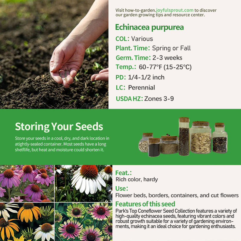 Park's Top Coneflower Seed Collection is like a dream garden combo. When you sow these seeds, you embark on an adventure of color and surprise. Mellow Yellows' gentle yellow flowers are as warm as sunshine, White Swan's pure white flowers are as elegant as fairies, PowWow Wild Berry's berry-colored flowers resemble mysterious gemstones, and Green Twister's multicolored petals resemble playful elves. Together, they create a beautiful symphony in your garden, bringing endless vitality and vibrancy to your landscape.