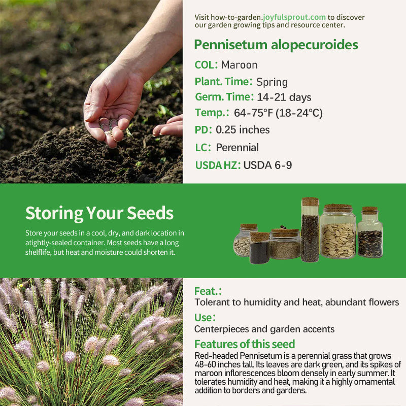 Red-headed Pennisetum is an early-flowering summer ornamental grass. The plant grows 48-60 inches tall, with tall, sturdy stems. Its linear, dark green leaves are thick and dense, forming a full, clump-like shape. The dense foliage in summer provides a beautiful backdrop for the inflorescences. Uniquely, its spikes of 8-10 inches long begin blooming in early summer (June-July), forming dense, upright inflorescences at the top of the stems. Their striking "flaming torch" appearance is striking, and their flowering period continues into autumn. This variety is highly tolerant of humidity and heat (USDA zones 6-9) and thrives in hot, rainy southern regions. It blooms more profusely in full sun and has low soil requirements.