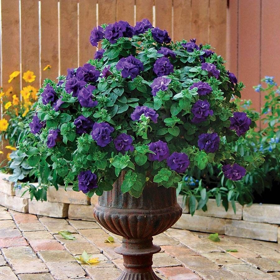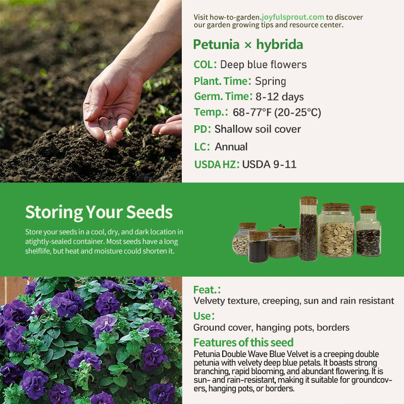 Petunia Double Wave Blue Velvet is a classic creeping double petunia, combining the advantages of double blooms with a creeping growth pattern. Its petals are a rich deep blue, covered in fine hairs, giving it a velvety feel and a more luxurious appearance than typical blue petunias. The flowers are a double rosette, with layers of petals forming a dense, dense pattern. The flowers are approximately 2.5-3.5 inches in diameter and are densely packed, with 5-8 blooms per creeping branch. The plant has a strong branching ability, and the branches can extend to 30-40 inches. When planted in the ground, it can form a "blue velvet flower carpet" in 2-3 months. When planted in a hanging pot, it will hang down into a plump flower ball with a diameter of about 50 cm. It is highly resistant to sunlight and rain, and its color remains resistant to fading even in strong summer sunlight.