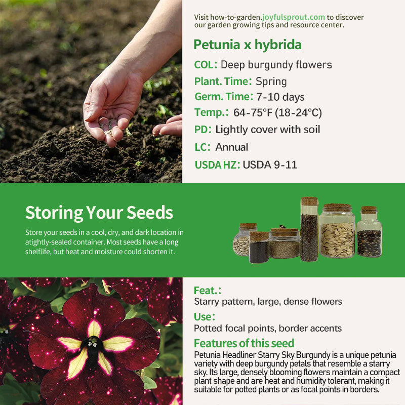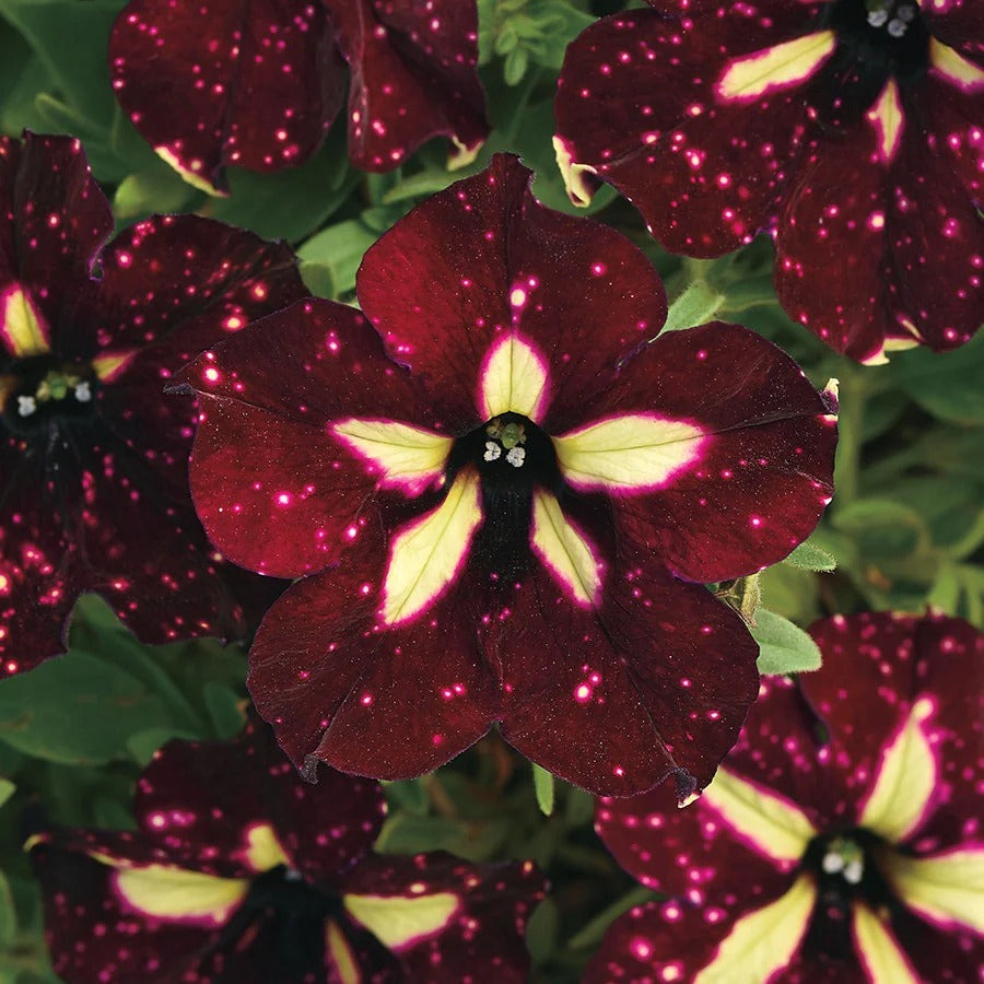 Petunia Headliner Starry Sky Burgundy is a visually striking petunia variety. Its deep burgundy petals are rich and mellow, with tiny white dots randomly scattered across the surface, resembling stars in the night sky. This unique pattern sets it apart from other varieties. The flowers are approximately 3-4 inches in diameter, with thick, glossy petals and densely packed blooms. At peak bloom, they cover the branches and leaves with virtually no visible gaps. The plant is compact, reaching a height of approximately 10-14 inches, with evenly branched branches, requiring minimal pruning to maintain its neat shape. Its core strength is its resistance to heat and humidity, making it resistant to flower rot and fading in high summer temperatures and humidity. Its flowering period lasts from spring to the first frost of autumn.