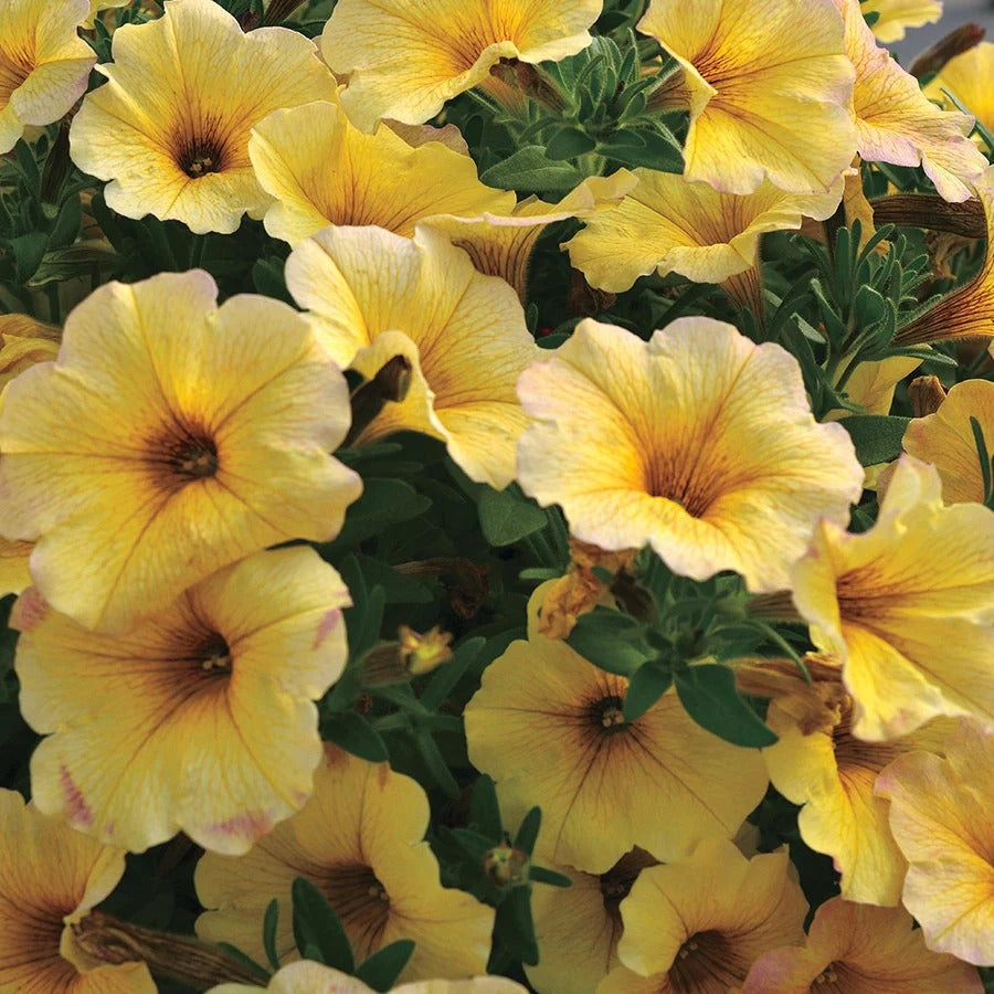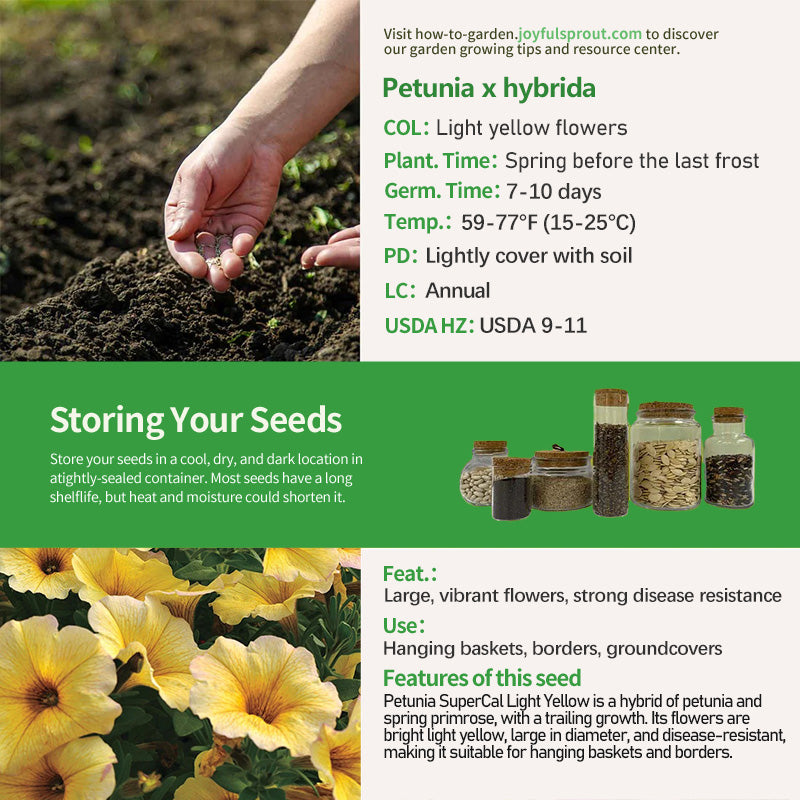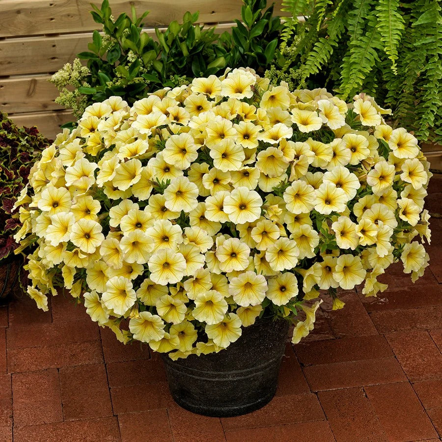 Petunia SuperCal Light Yellow is a hybrid of petunia and spring primrose, with a distinct trailing growth pattern. Its branches are soft and flexible, growing naturally downward, reaching 30-46 cm in length. Its flowers are a fresh, bright light yellow that shimmers in sunlight. They are large, typically reaching 3-4 inches in diameter. It has strong growth vigour and good disease resistance, making it suitable for a variety of environments. It is well-suited for hanging baskets, where its drooping branches create a cascade of flowers. It can also be planted along borders to add a soft, bright layer of color.
