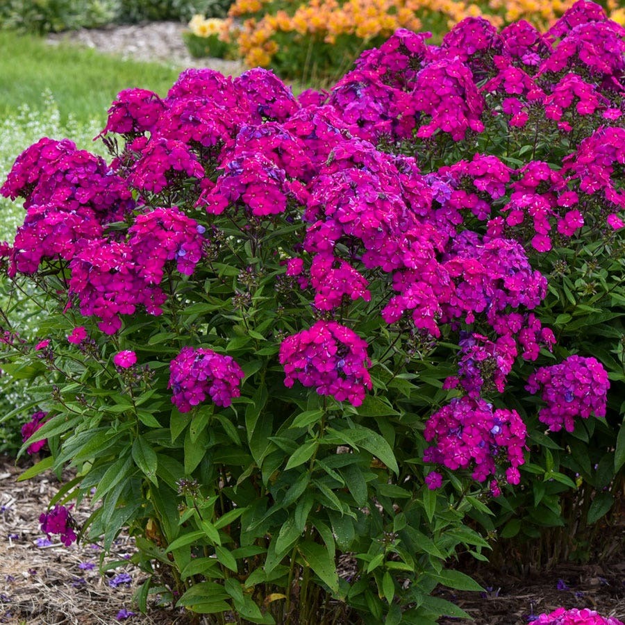 Phlox Luminary 'Ultraviolet' is a premium variety of tall garden phlox. The plant is relatively tall, reaching 32-36 inches tall at maturity, with a wide, dense, bushy appearance. Its bright green leaves add a unique texture. Its striking red flowers feature thick, finely haired petals, each 1-1.5 inches in diameter. The numerous flowers form large, conical inflorescences that almost completely cover the leaves when in bloom. Its delicate fragrance wafts on the summer breeze. This variety is more disease-resistant than common phlox.