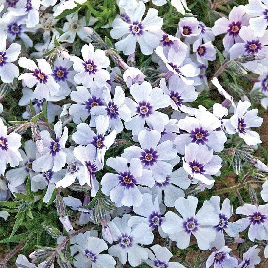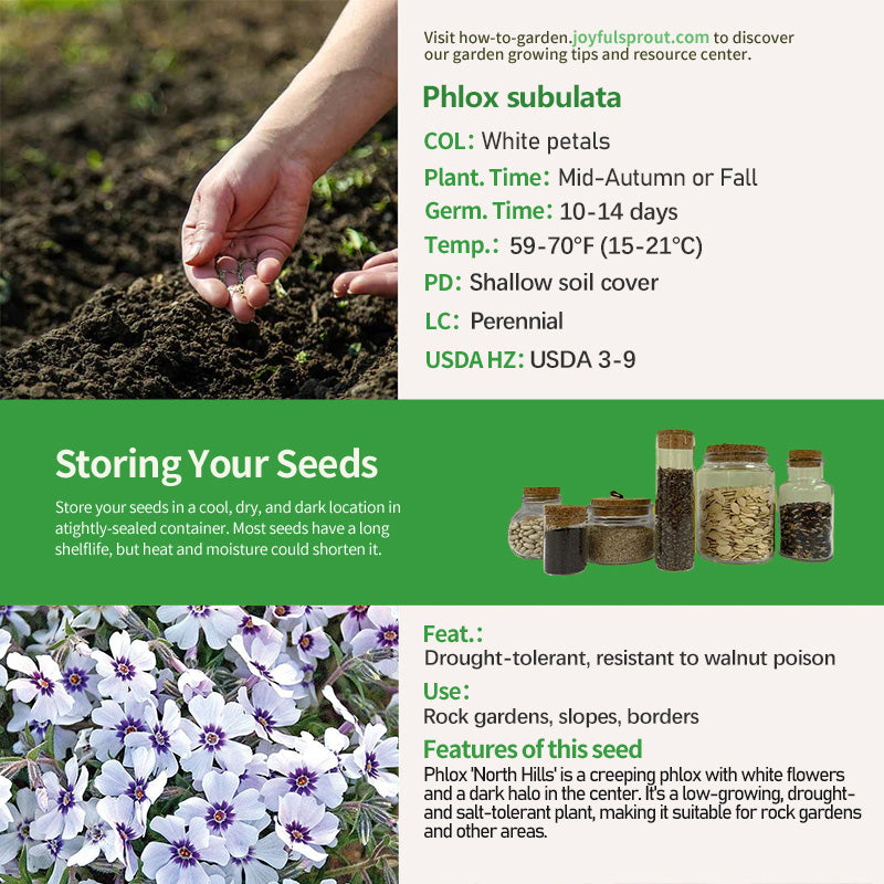 Phlox 'North Hills' is a perennial groundcover with small, star-shaped, white flowers with a dark halo in the center, creating a striking effect. Reaching only 4-6 inches tall and 12-18 inches wide, it blooms profusely in late spring, covering the ground and may bloom again in the fall. It enjoys light and adapts to a wide range of soil conditions, including normal, sandy, and clay soils. It is drought-tolerant, salt-tolerant, and resistant to walnut poison. It attracts butterflies and bees, making it ideal for rock gardens, slopes, and borders, where it can effectively control soil erosion.