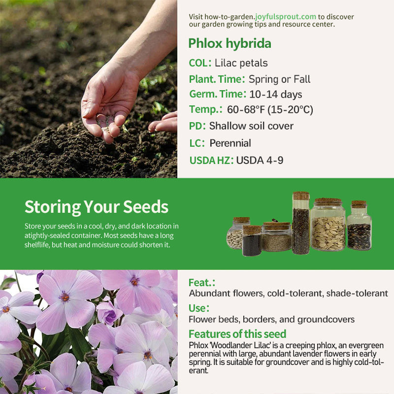 Phlox 'Woodlander Lilac' is a creeping phlox, an evergreen perennial. Its five-petaled, lavender flowers are larger than those of typical needle-leaved phlox varieties, creating a bright, dense carpet of flowers. The plant has a spreading habit, with linear to tapering leaves, allowing it to quickly fill open spaces. It is cold-tolerant, withstanding temperatures as low as -34°C, and is adaptable to full sun or partial shade. It has a moderate soil tolerance and tolerates poor soil conditions, making it suitable as a groundcover, planted along the edges of flower beds, under forests, or in mixed borders. It can also be used as a standalone accent plant.