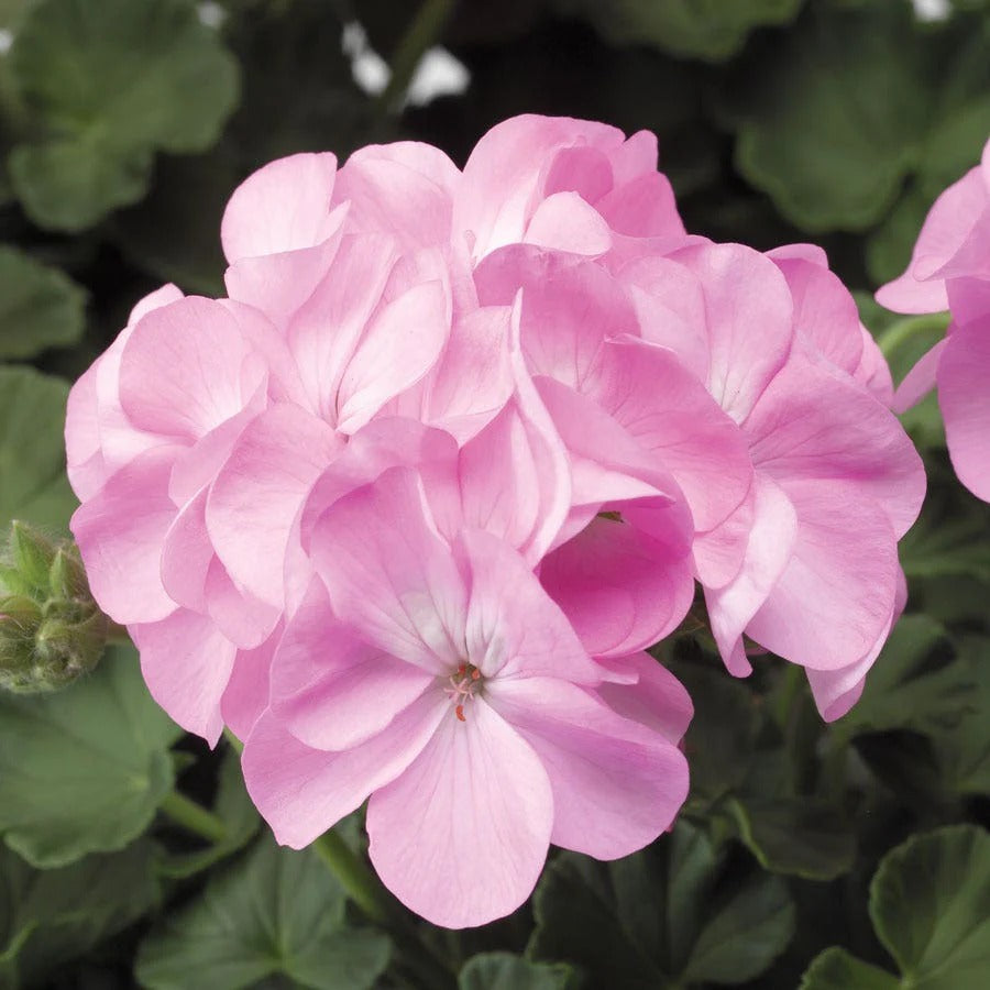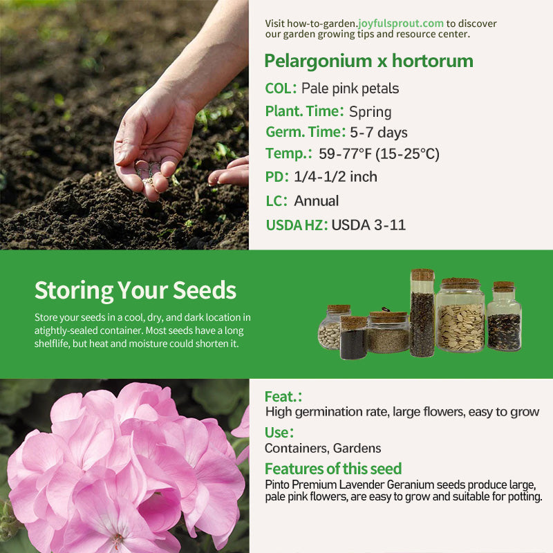 Pinto Premium Lavender Geranium seeds produce upright plants 12-18 inches tall with a 12-inch crown. The pale pink flowers are borne in large, 4-5-inch clusters, creating a striking effect. This variety has a high germination rate of 89% and can be sown directly after a frost or indoors in early spring and transplanted 8-10 weeks later. The plant prefers moderately moist, well-drained soil rich in organic matter and is hardy to USDA zones 3-11, making it suitable for both container planting and garden cultivation.