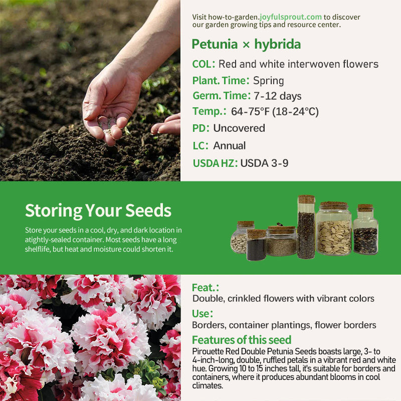 Pirouette Red Double Petunia Seeds produces stunning petunias. The flowers reach 3- to 4-inch diameters, with cascading double petals resembling intricately sculpted works of art. The interwoven red and white petals create a striking contrast that complements the main body. Growing 10- to 15-inches tall, it creates a beautifully layered effect at the front of a border, complementing taller flowers behind. It also offers a unique display in containers like pots and buckets. In cool, mild climates, it blooms tirelessly and profusely, providing a lasting display of vibrant color.
