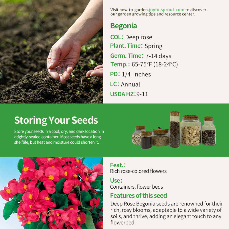 In a corner of your garden, Pizzazz Deep Rose Begonia seeds capture everyone's attention with their rich, rosy blooms. Each blossom resembles a delicate work of art, exuding a delicate fragrance that attracts bees and butterflies. Planting these begonia seeds will bring you the joy and fulfillment of gardening. They are highly adaptable and can grow in a variety of soils, easily adding an elegant touch to your flowerbed. Every time they bloom, you'll feel the vitality and beauty of life, as if engaging in an intimate conversation with nature. Deep Rose Begonias are an indispensable part of your garden, bringing every corner of your garden to life.
