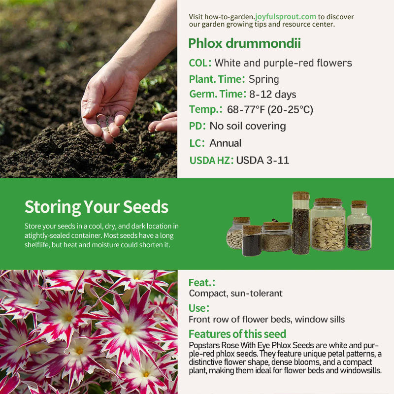 Popstars Rose With Eye Phlox Seeds is a highly recognizable phlox variety, distinguished by its unique flower design. Its petals are a uniform, soft white and purple-red color, and a unique pattern on the petals creates a vibrant and unique look, like "eye contact lenses." The flowers bloom in clusters of 8-12, each measuring approximately 1-1.2 inches in diameter. At peak bloom, the clusters cover the top of the plant, making the leaves nearly invisible. The plant is compact, reaching a height of approximately 10-14 inches, with moderate branching ability, requiring no pruning to maintain its neat shape. Its small, emerald green leaves do not overshadow the flowers. Its flowering period lasts from late spring to summer. It is highly sun-resistant, and its colors do not fade even in strong summer sunlight. It is suitable for planting in the front row of flower beds, in small pots on windowsills, or as a flower border embellishment paired with white flowers. Its "eye-spot" design quickly attracts attention.