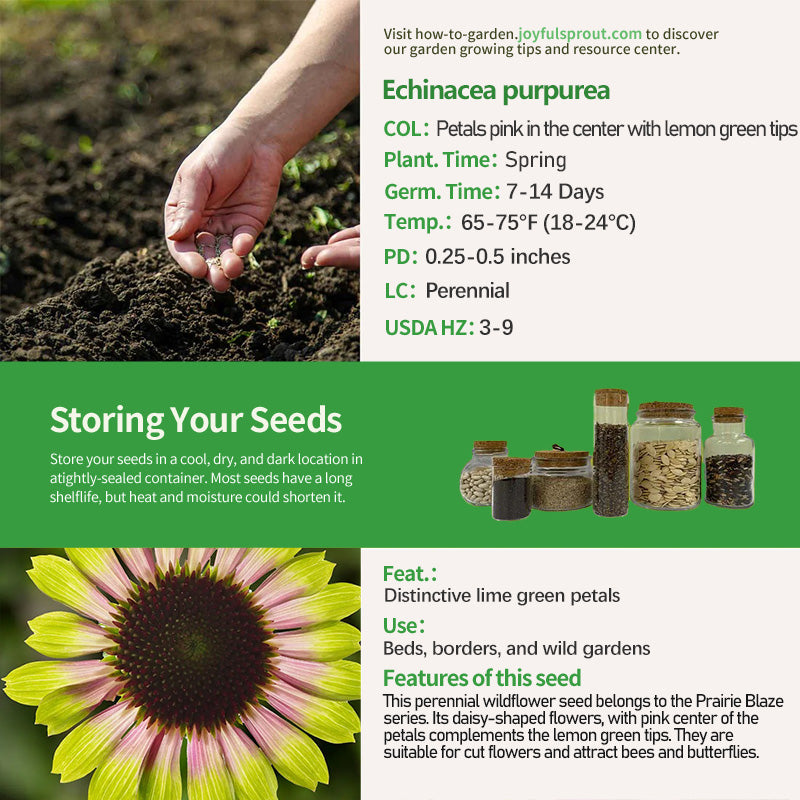 In the garden of an old estate, a gardener was struggling to find a way to add unique color. By chance, he came across Prairie Blaze Vintage Lime Coneflower Seeds. He planted them with great anticipation, and soon, tender green buds emerged. Over time, the plant grew taller, becoming compact and upright. When it bloomed, the petals pink in the center with lemon green tips bloomed like stars, adorning the garden. Bees and butterflies were attracted by the fragrance and flitted busily among the flowers, instantly bringing the estate to life—all thanks to this miraculous seed.