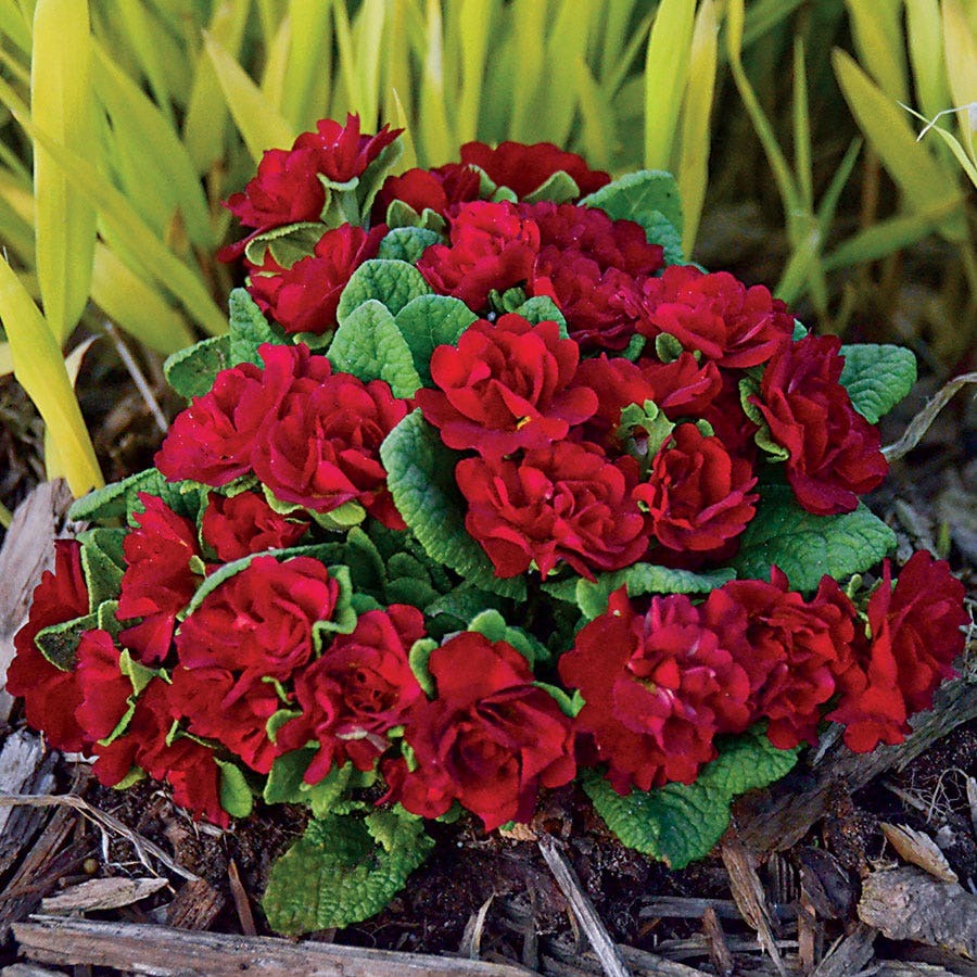 Primula Belarina Valentine is a double-petaled primrose designed for romantic settings. Its flowers are a pure, rich red, free of distracting colors, boasting a vibrant color saturation, reminiscent of a Valentine's Day rose. Its tightly packed double petals, stacked in layers and slightly curled at the edges, measure approximately 2-2.5 inches in diameter. When in full bloom, they resemble miniature red pompoms, with up to 8-12 flowers per plant, strikingly clustered among the emerald green foliage. The plant grows approximately 7-9 inches tall, forming a compact rosette. Its oval, glossy, dark green leaves create a striking contrast to the red flowers. It prefers a cool climate, ideally growing between 8-18°C (8-18°C). Its blooming period lasts from late winter to early spring, perfectly coinciding with Valentine's Day.
