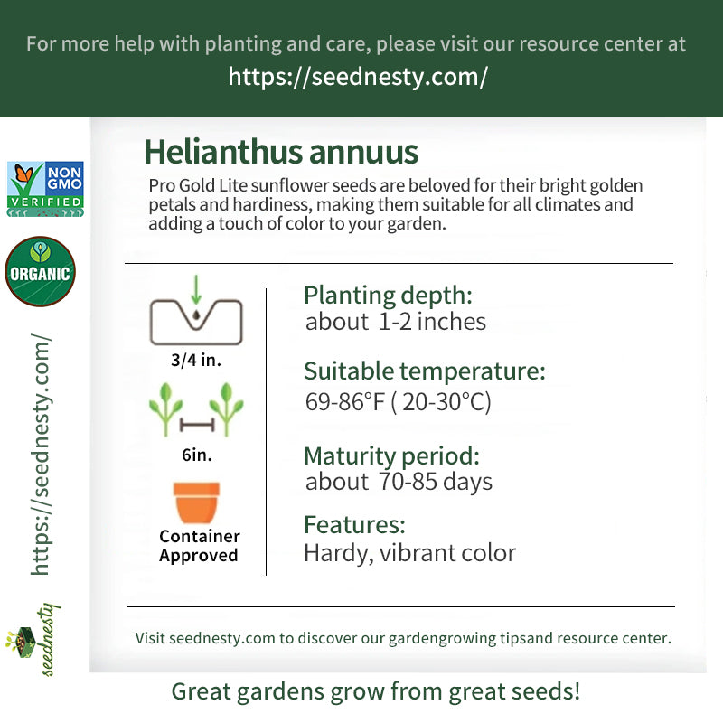Pro Gold Lite sunflower seeds bloom in the sunlight, their bright golden petals radiating like the sun, bringing warmth and joy. Their hardiness allows them to thrive in all climates, making them an indispensable part of your garden. Imagine strolling through your garden and spotting these dazzling sunflowers, a wave of joy and contentment will well up in your heart. Pro Gold Lite sunflowers are perfect for flowerbeds or as cut flowers, adding a touch of natural charm to your home. Every time you see these flowers, you're transported to the beauty and wonder of nature, filling your life with color and inspiration.