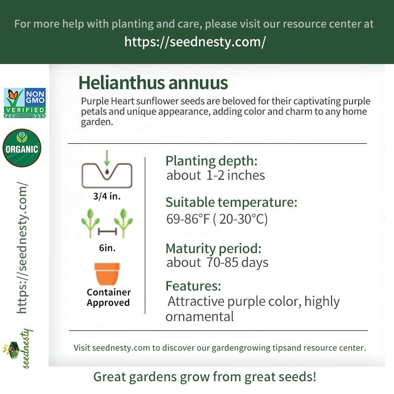 Purple Heart sunflower seeds bloom in the sun, their captivating purple petals a dreamlike hue that brings warmth and joy. Their unique appearance makes them a vibrant spot in any garden, attracting countless bees and butterflies. Imagine your family playing in the garden, surrounded by these beautiful sunflowers, filled with joy and laughter. Purple Heart sunflowers are not only perfect for flowerbed decoration, but also add a unique touch to your garden. Every time you see these flowers, you feel the charm of nature and the vitality of life, filling your life with joy and color.