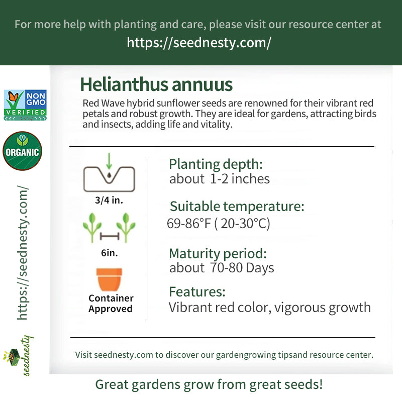 Red Wave hybrid sunflower seeds are beloved for their vibrant red petals and robust growth. Imagine a sunny day filled with Red Wave sunflowers bursting into bloom in your garden, their vibrant colors a cheering, overflowing energy. Their fiery petals attract bees and butterflies, becoming the dancing stars of nature. Whether used as the centerpiece of a flower bed or as a decorative cut flower, Red Wave sunflowers add a touch of vibrant color to your life. Every time you see these flowers, a wave of warmth and joy surges in your heart, as if all worries are dispelled by their beauty. Let Red Wave sunflowers be the stars of your garden, bringing endless surprises and laughter.