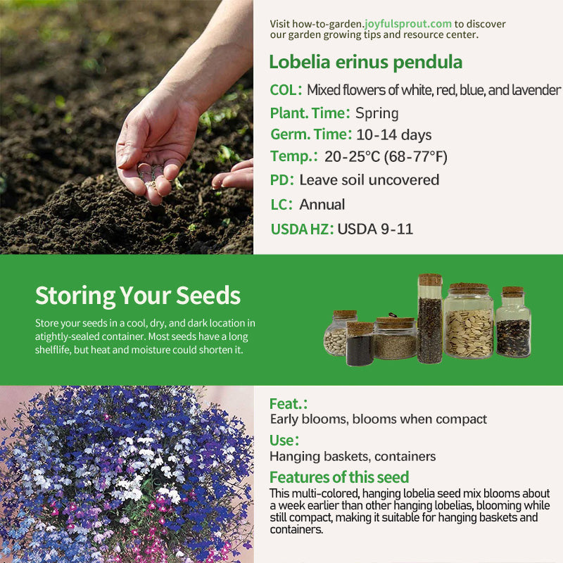 This is a multi-colored, hanging lobelia seed mix. The seeds are multi-coated, offering several advantages for growers. It blooms early, up to a week earlier than other hanging lobelias. Blooming while the plant is still compact, it facilitates early-season sales. Its rich variety of flowers, including white, red, blue, and lavender, provides vibrant color throughout the summer. It is often used in hanging baskets and containers for its decorative qualities.