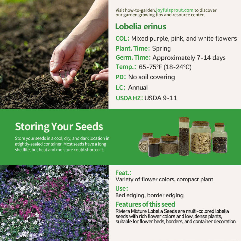 Riviera Mixture Lobelia Seeds is a charming lobelia seed assemblage. The clever blend of various flower colors creates a vibrant and colorful visual effect. The plants are compact and low, with good branching, and the blooms are lush and long-lasting. They add a romantic and exquisite atmosphere to the landscape, creating a rich and colorful landscape whether used in flower borders, flower bed edges, or container pots.