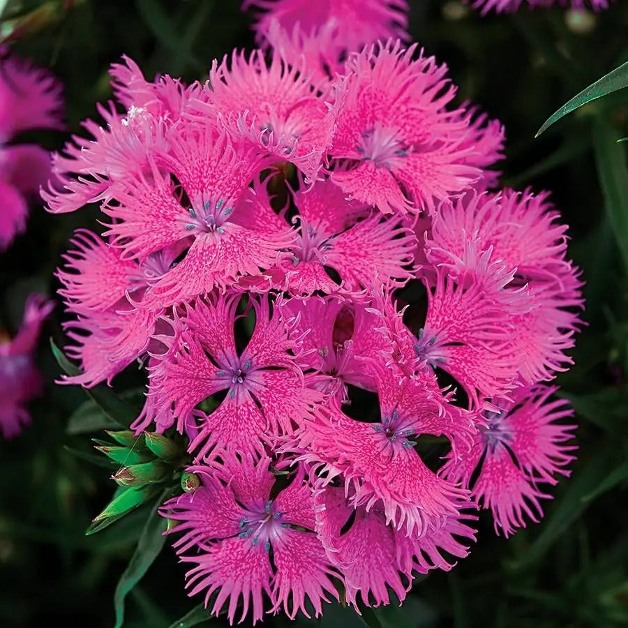 Rockin' Purple is a perennial dianthus with an upright, sturdy plant (18-24 inches) and deep purple petals with a delicate lace border. It blooms from spring to fall and is exceptionally cold-tolerant (USDA zones 3-9). Its gray-green leaves and upright flower stems are drought-tolerant and resilient, making it suitable for perennial flower borders and sunny, open spaces. This hybridized cultivar can overwinter to temperatures as low as -29°C, and its flower color is more vibrant in cool climates. It requires full sun and slightly alkaline soil. Germination occurs 4-7 days after sowing, and a recommended spacing of 12 inches between plants is recommended. It can be used as a background in flower borders or combined with ornamental grasses to create a lasting landscape effect.
