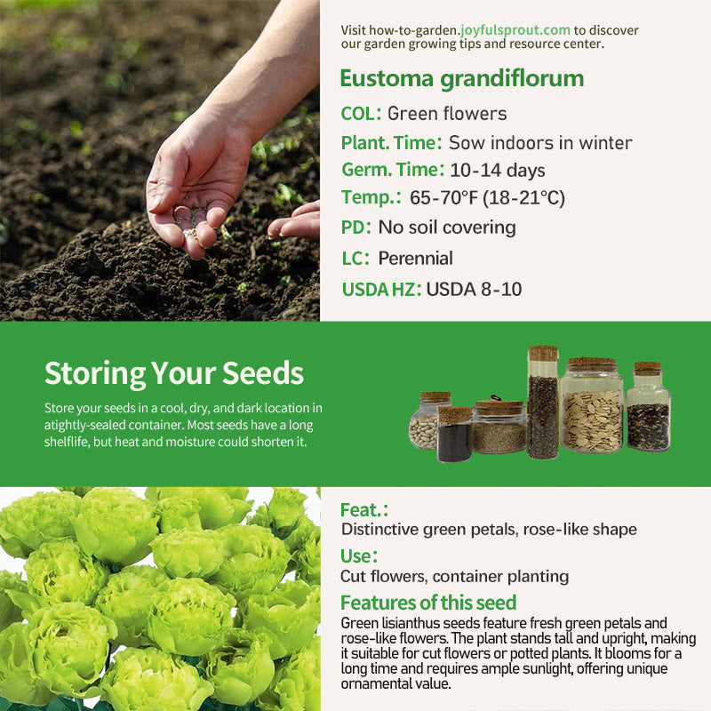 This lisianthus seed features distinctive green petals. The flowers are rounded like miniature roses, with a light, glossy texture. When in bloom, they resemble jade-carved green blossoms. The plant grows 24-30 inches tall, with upright stems, making it suitable for vase-shaped cut flowers, where it can last for over two weeks. It requires ample sunlight for optimal color, thrives in warm, humid conditions, and blooms from early summer to autumn. Whether planted alone in a pot on a balcony or alongside colorful flowers in a border, its refreshing green color creates a unique visual experience, making it an excellent choice for those seeking a niche floral style.