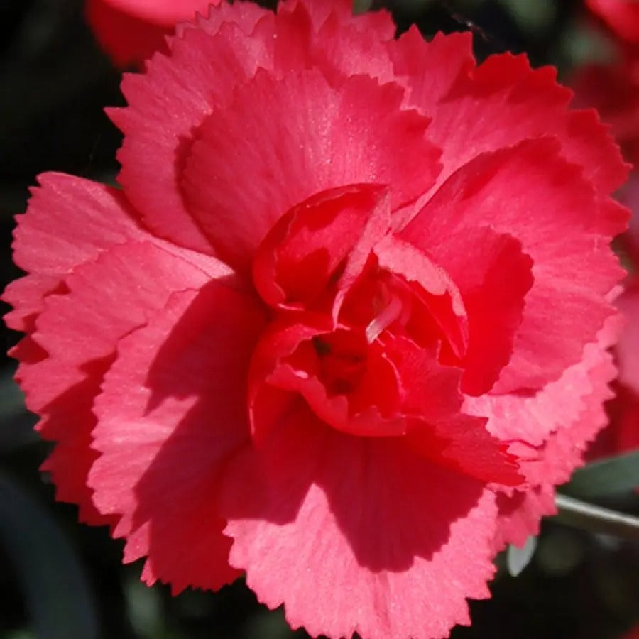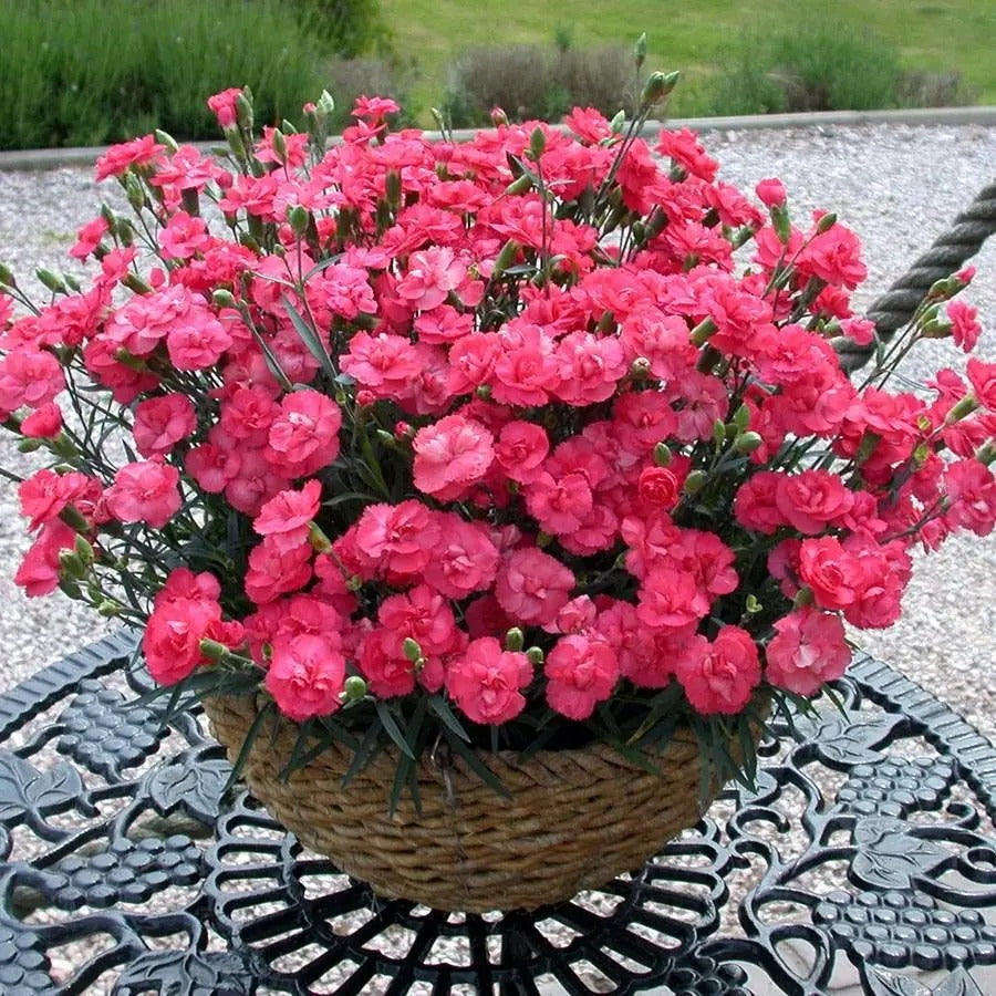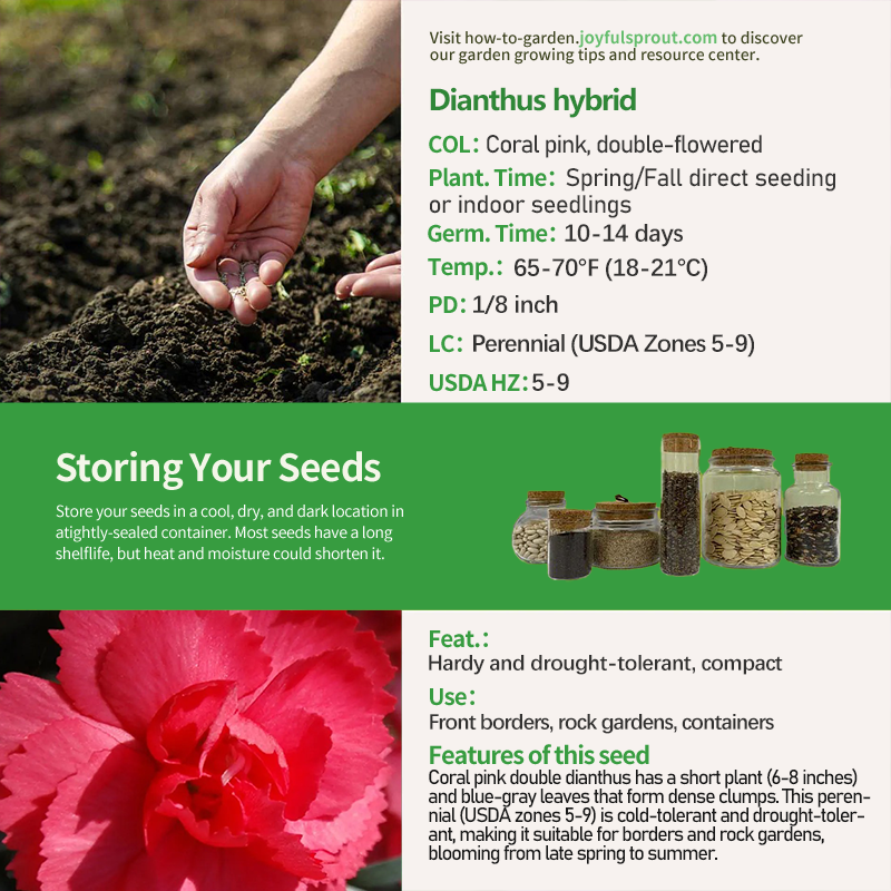Coral pink double dianthus features dense, spherical flowers with slightly ruffled petal edges. It grows a short plant (6-8 inches) and forms dense clumps of blue-gray leaves. This perennial (USDA zones 5-9) requires full sun and well-drained soil. Germination occurs 10-14 days after sowing, and a 1/8-inch layer of soil is required. It is cold-tolerant, withstanding temperatures as low as -23°C and drought-tolerant, making it suitable for rock gardens, borders, and small containers. It blooms from late spring to summer, and light pruning after flowering can encourage a second bloom in autumn. This variety, developed through natural hybridization, has a stable flower color and leaves that remain evergreen through winter, making it a valuable addition to cool-season landscapes.
