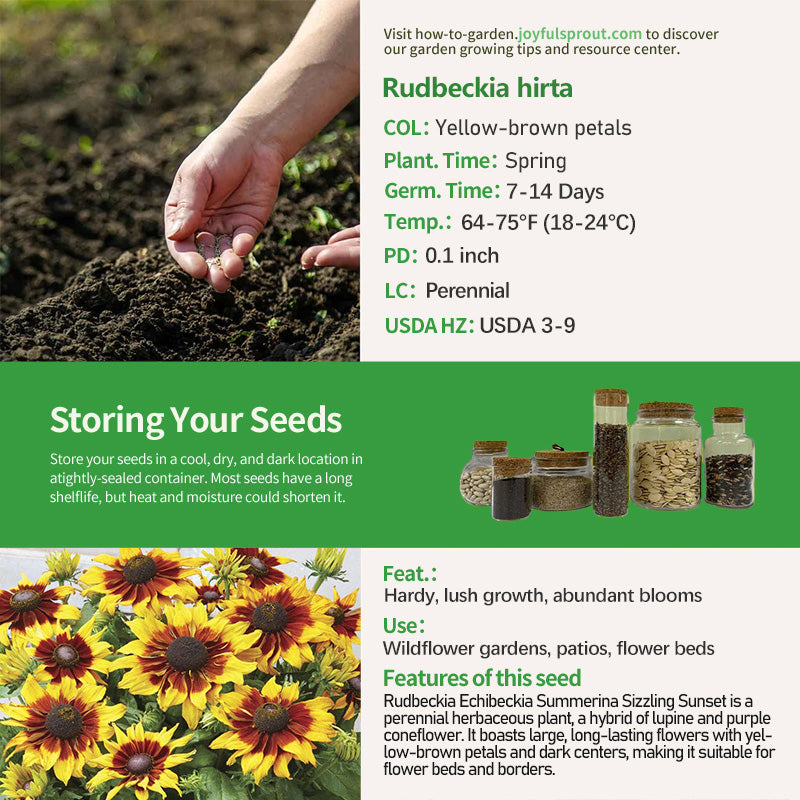 Rudbeckia Echibeckia Summerina Sizzling Sunset is easy to grow and maintain. It has a compact, upright, mound-like habit and rapid growth. Its daisy-shaped flowers, up to 6 inches in diameter, bloom from early summer to late autumn, with yellow-brown petals and dark centers. The flowers, solitary on sturdy stems, make excellent cut flowers, with each flower lasting up to 10 weeks. It prefers full sun and organically enriched, moist, well-drained soil. It is adaptable to a variety of soils and is disease-resistant.