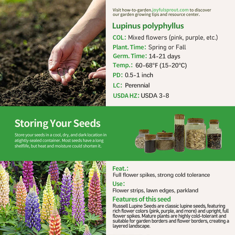 Russell Lupine Seeds are a classic lupine variety, boasting rich flower colors and full flower spikes. They come in a variety of harmonious shades, including pink and purple. After sowing, mature plants develop upright flower spikes up to 12-18 inches in length, resembling a colorful "style." They bloom continuously from late spring to early summer, creating a striking visual impact. Plants grown from these seeds are highly cold-tolerant and can overwinter in USDA zones 3-8, continuing to bloom healthily the following year after experiencing low winter temperatures. They are adaptable to a wide range of soils, preferring loose, breathable, slightly acidic soils. They are suitable for planting in the middle of garden borders, flower borders, or lawn edges, creating a rich layered effect alongside flowers like irises and daisies.