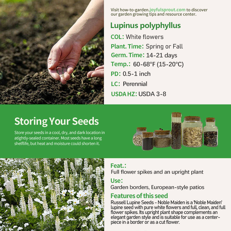 Russell Lupine Seeds - Noble Maiden is the "pure representative" of lupines. Its flowers are a pure, snow-white color, free of any distracting colors. Its petals are delicate, and its flower spikes are full and firm, approximately 16-20 inches long. When in full bloom, they resemble "white columns," exuding a noble and elegant aura, perfect for European or minimalist gardens. Plants grown from seed have an upright shape, sturdy stems, and strong support, making them resistant to falling even when their flower spikes are full. They are suitable for use as centerpieces in borders or as individual clumps along lawn edges. They are cold-tolerant and can overwinter in USDA zones 3-8, continuing to bloom healthily the following year after low winter temperatures. It is adaptable to a wide range of soils, preferring slightly acidic soils. Daily care requires adequate sunlight and avoid prolonged shade and dampness.