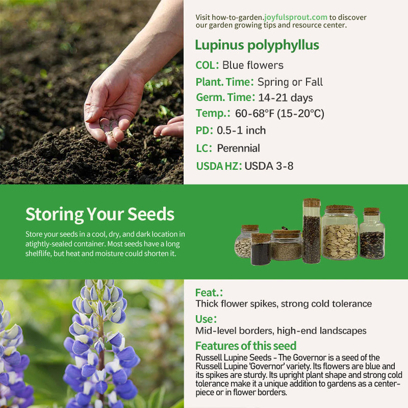 Russell Lupine Seeds - The Governor is a rare dark lupine variety. Its flowers are blue and its spikes are sturdy and slender, measuring approximately 20-24 inches in length. When in bloom, it stands tall in the garden like a column, creating a calming and recognizable style. As a classic of the Russell Lupine family, it inherits the cold and cool characteristics. After a low winter, it blooms healthily again the following spring, allowing for years of enjoyment from a single sowing. Its upright plant shape makes it suitable for centerpieces in flower borders or as a single plant in a clump, complemented by other flowers to highlight its unique color.