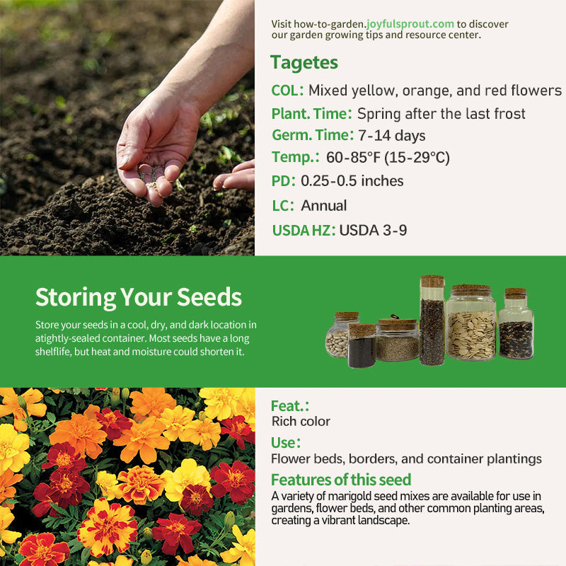 Marigolds grown from this seed mix may include a variety of flower colors, including yellow, orange, and red. Plant height and crown width vary depending on the variety, generally ranging from 8 to 16 inches. They thrive in sunny, well-drained environments. They can be used extensively in gardens, flower beds, and borders, creating a vibrant and colorful landscape in courtyards, parks, and other areas. They are also suitable for potted plants, adding a touch of elegance to indoor and outdoor spaces.