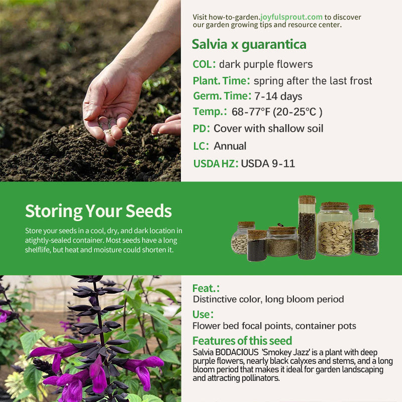 Salvia BODACIOUS 'Smokey Jazz' is a very distinctive variety of sage. The plant stands tall, with stems and calyxes that have a distinctive deep black-purple hue, and the bright dark purple flowers provide a strong, layered color contrast. The foliage is bright green and moist, providing an excellent backdrop for the flowers. Its long bloom cycle, lasting from late spring to fall, allows it to continue to play a decorative role in the horticultural landscape. It is well adapted to its environment and grows robustly in full sun and well-drained soil.