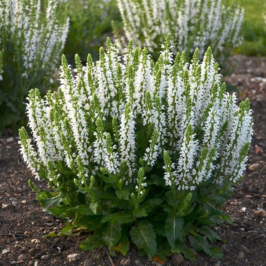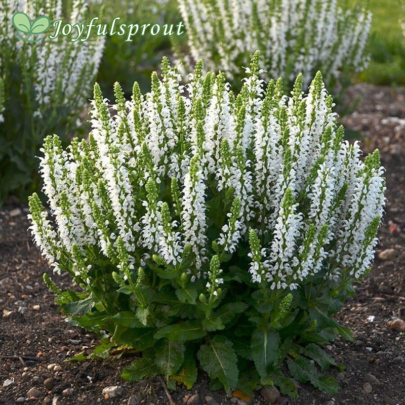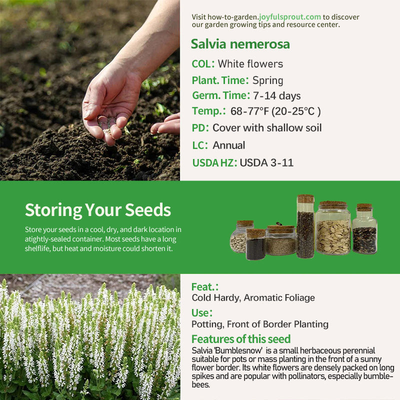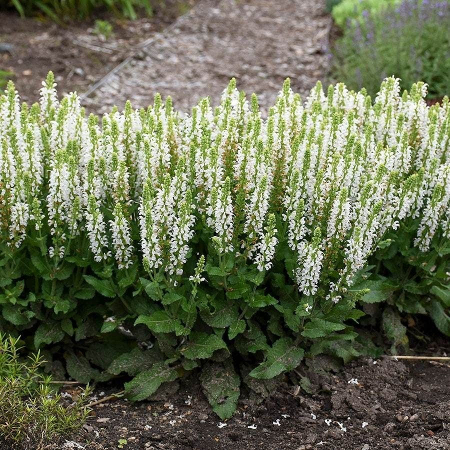 Salvia 'Bumblesnow' is hardy, and the plant is small in size but packs a powerful punch. Its upright clumps of green leaves with ruffled surfaces are fragrant, a trait that keeps deer and rabbits'at bay'. The long flower spikes are closely packed with pure, white flowers that are elegant from the outside. These flowers are favored by pollinators, especially bumblebees that often travel through them. The seed heads left behind after the flowers fade are in turn a source of food for birds.