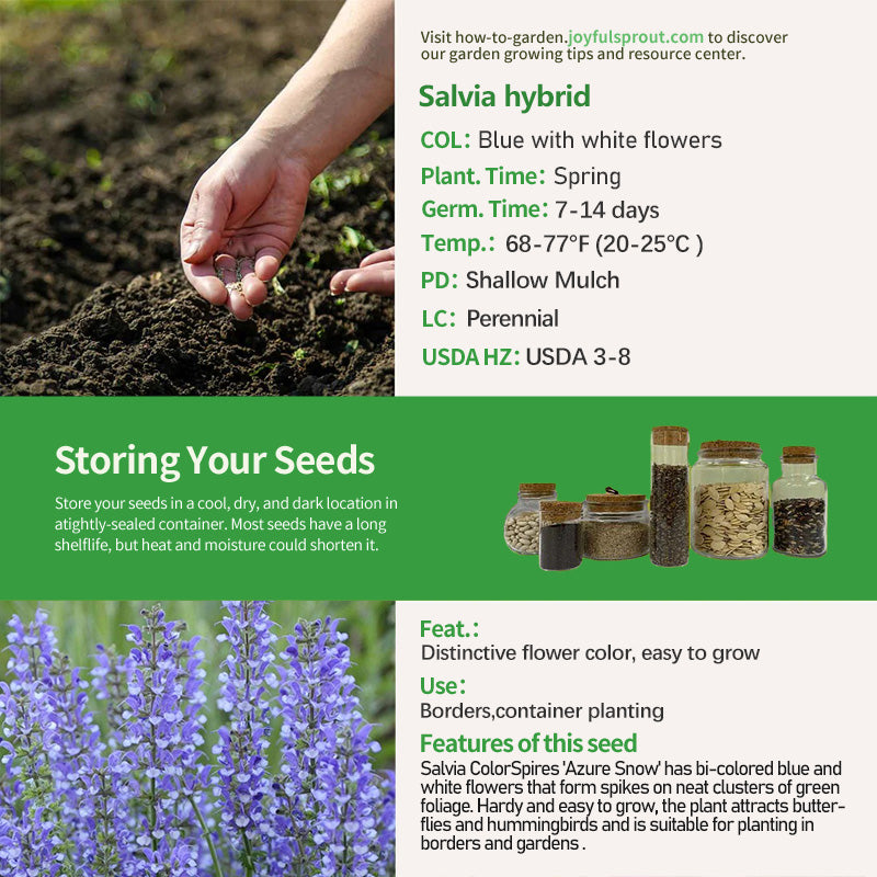 Salvia ColorSpires 'Azure Snow' has distinctive flowers in a two-tone combination of blue and white that grow in profusion along the upright flower spikes. Below the flower spikes are neat clusters of green foliage with a hint of herbaceous fragrance. It is a hardy perennial that can be easily grown in zones 3 - 8. The plant is small, generally 1 - 2 feet in height and width, making it ideal for container planting and a space saver. It also grows well in flower beds and patios.