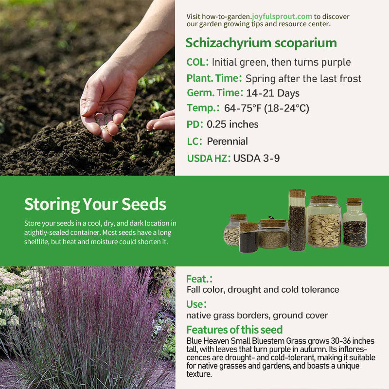 Blue Heaven Small Bluestem Grass is a representative of the "blue-leaved" ornamental grasses. This perennial plant grows 30-36 inches tall in clumps, with slender, linear leaves that are soft and delicate. Initially a bright green, it resembles "green velvet," with a delicate touch. In autumn, the leaves gradually turn purple, transitioning from tip to base, creating a rich, gradated color palette. In early autumn, silvery-white spikes of flowers emerge, growing upright, creating a striking contrast with the changing color of the leaves. This variety is drought- and cold-tolerant, and tolerates poor soils. Its leaves are more vibrant in full sun, but it remains ornamental in partial shade. Suitable for native grass borders and rock gardens.