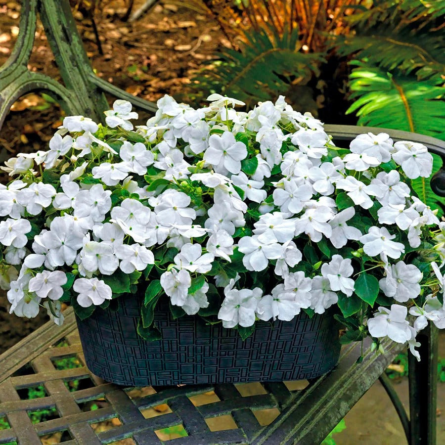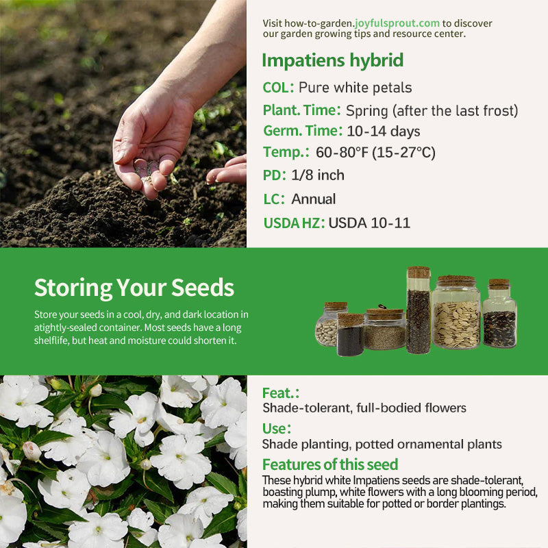 These hybrid Impatiens seeds feature pure white flowers with round, full petals and delicate, cascading petals. Designed for shade-tolerant environments, they bloom normally in the shade or indoors in diffused light, blooming throughout the warm season. Their even, compact growth makes them ideal for potted plants, window sills, or as grouped plantings at the edge of a border. Their white flowers appear fresh and elegant in shade, adding a touch of brightness to any space. They are easy to care for and require minimal soil.