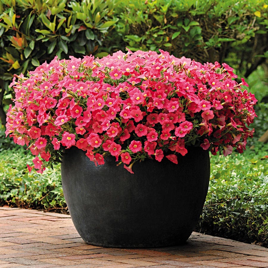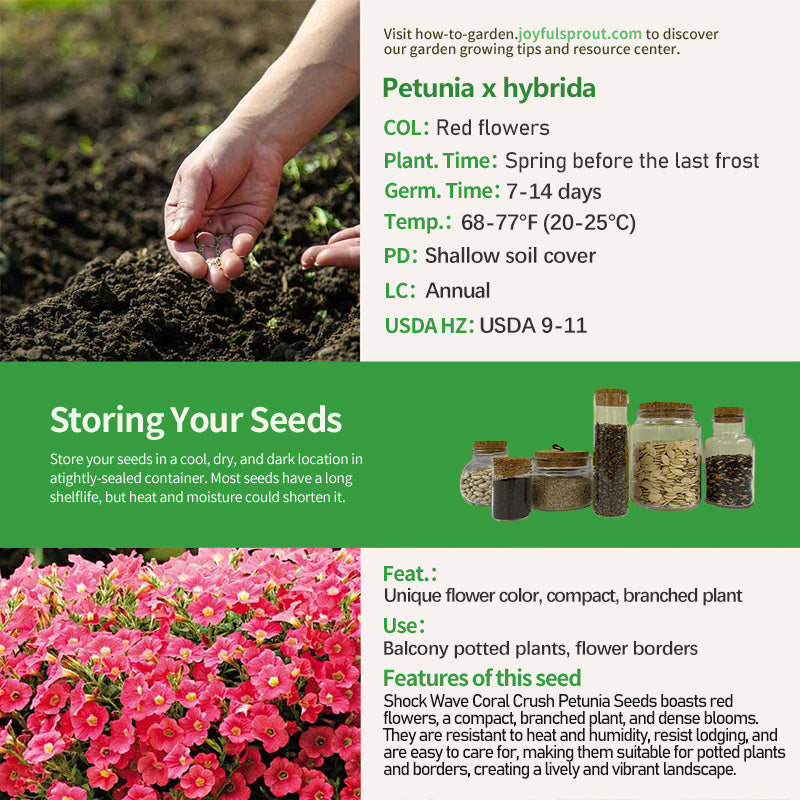 Shock Wave Coral Crush Petunia Seeds stand out with their distinctive red flowers, a warm, vibrant hue that soothes like a setting sun. The petals are delicately textured, and when in full bloom, the flowers are so dense that they cover the branches and leaves, forming a plump "red ball." The plant is compact, reaching only 8-10 inches in height. It has strong branching ability, naturally developing a rounded shape without topping. Its sturdy stems resist lodging, maintaining its shape even in rainy and windy summer weather. Its exceptional tolerance to heat and humidity makes it less susceptible to disease in hot and humid southern regions. Its flowering period lasts from late spring to late autumn, with new buds continuously emerging during this period. Daily care is simple; simply ensure adequate sunlight and moderate watering for healthy growth.