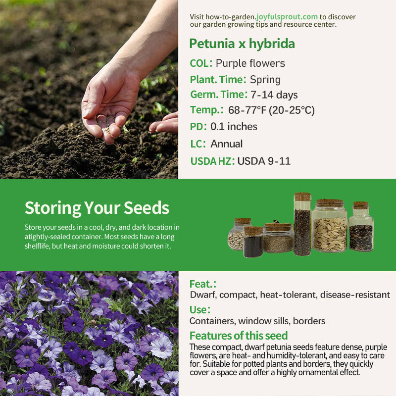 Shock Wave Denim Shades petunia seeds are a premium variety designed for compact borders and small spaces. Their flowers are a unique, soft, layered purple hue, with a subtle, natural smudge effect around the edges, creating a fresh and elegant look. The plant maintains a compact, low-growing form, reaching only 8-10 inches in height. Its strong branching ability allows it to form a full, densely packed bush without extensive pruning. Its dense blooms cover the entire plant, making the leaves almost invisible at peak bloom. This variety exhibits excellent environmental adaptability and exceptional heat and humidity tolerance, resisting wilt in high summer temperatures and humidity. It also exhibits some resistance to common petunia diseases. Planting is simple, requiring no complex care techniques, making it easy for both novice and experienced growers. It's suitable for balcony pots, window sills, or borders, quickly enhancing the beauty of any landscape.