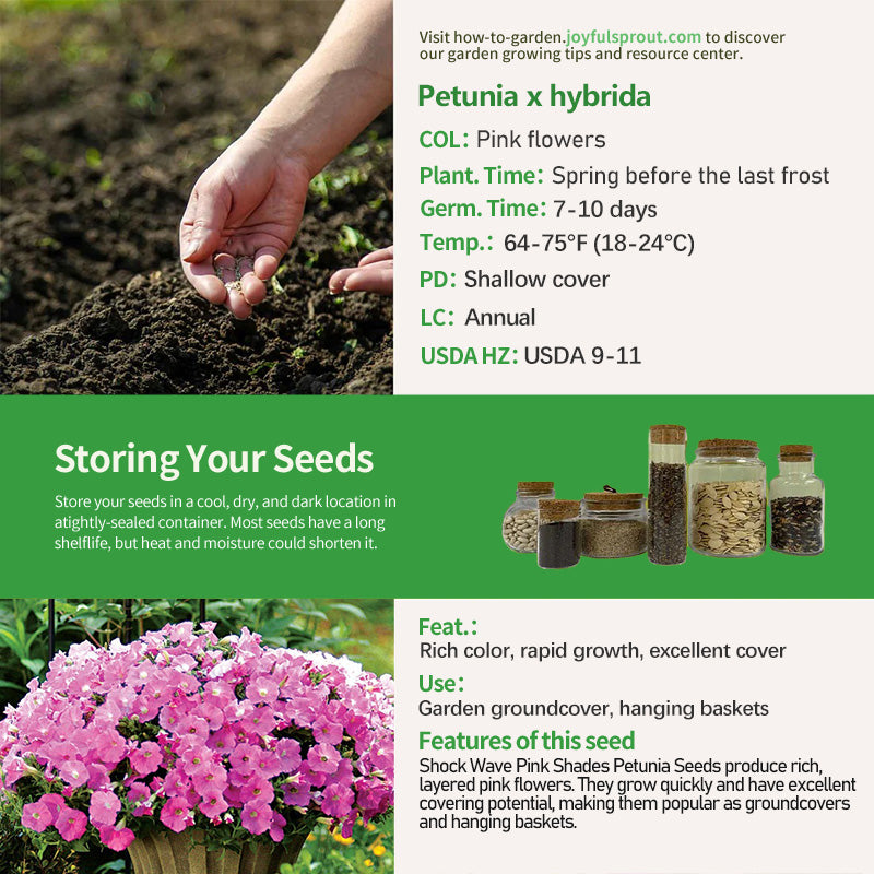 Shock Wave Pink Shades Petunia Seeds boasts fast growth and strong covering potential, with branches spreading rapidly to form a dense carpet of flowers. The flowers are a rich pink, resembling waves of pink. The blooms are abundant, approximately 2-3 inches in diameter. They are heat- and drought-tolerant, maintaining their blooms even in the heat of summer. They are often used as garden groundcovers, quickly covering bare ground and creating large pink landscapes. They also lend themselves well to hanging baskets, where their dangling branches create layers of cascading flowers, creating a stunning ornamental display.
