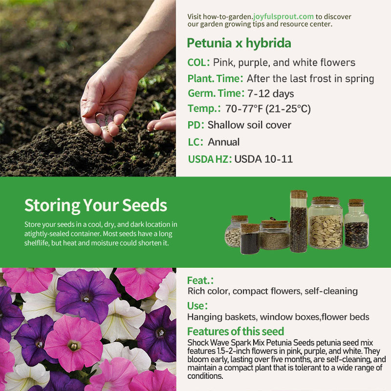 Shock Wave Spark Mix Petunia Seeds is a seed mix that produces small petunia flowers measuring 1.5-2 inches in diameter. The petunia flowers come in a rich variety of colors, including pink, purple, and white, creating a vibrant, vibrant floral experience. The compact plant, reaching a height of 7-10 inches, quickly fills any growing space. This variety boasts a remarkable early flowering characteristic. Due to its low sensitivity to day length, it blooms early in spring and can last for five months or longer. The petunia flowers are self-cleaning, dropping off old blossoms automatically, eliminating the need for manual removal. It is highly tolerant to environmental stresses such as rain, humidity, and heat, bringing long-lasting, vibrant color to any growing space.