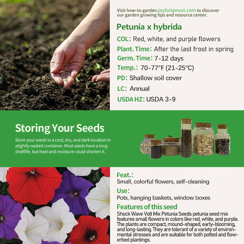 Shock Wave Volt Mix Petunia Seeds produces a variety of petunias with small, 1.5-2-inch diameter flowers in colors like red, white, and purple. The compact, mound-shaped plants, 7-10 inches tall, quickly fill a planting space. This variety is known for its early flowering, with a low sensitivity to day length, allowing it to bloom early in spring and continue flowering for up to five months or more throughout spring, summer, and autumn. The flowers are self-cleaning, automatically dropping old blossoms, eliminating the need for manual removal. They are highly tolerant of environmental stresses such as rain, humidity, and heat, and can quickly recover after summer downpours.