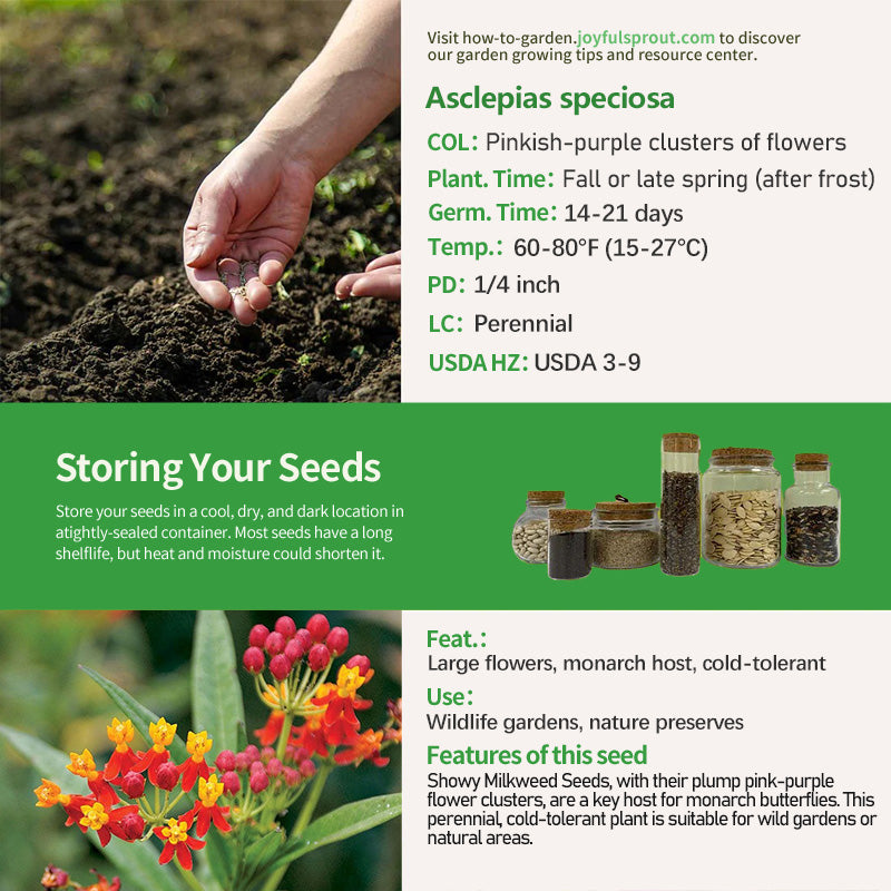 Showy Milkweed Seeds, scientifically known as Asclepias speciosa (Big-flowered Milkweed), grows into a perennial herb from seed. The plant grows 2-4 feet tall with broad, thick leaves. In summer, it produces large, plump, and fluffy pink-purple flowers, making them highly ornamental and lightly fragrant. As a key host plant for monarch butterfly larvae, it is crucial for maintaining butterfly populations. The plant is highly cold-tolerant, adapting to USDA hardiness zones 3-9, enjoying sunlight and tolerating poor soils, even in slightly saline soils. It is well-suited for wild gardens, nature reserves, or large flower borders, adding both beautification and ecological balance.