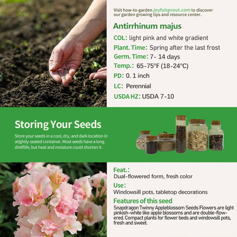 Snapdragon Twinny Appleblossom Goldfish Grass focuses on "fresh and sweet", with apple blossom-like light pink and white gradient flowers, and a unique double-flowered form that is cute and chic. Plants are 12-18 inches in height, compact and rounded, well-branched and densely flowered, with small, bright green foliage that does not shade the flowers. Flowering lasts from late spring to late summer, and is mildly drought tolerant, making it suitable for planting at the edge of flower beds to create a "sweet ribbon"or potted on windowsills and table tops to infuse a sense of freshness into small spaces.