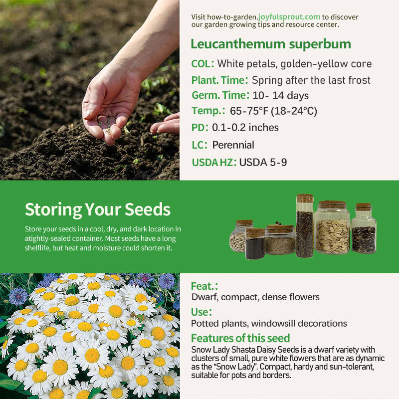 Snow Lady Shasta Daisy seeds are a dwarf variety designed for small spaces. At only 6-8 inches tall, they are compact and rounded, with no sprawl, making them ideal for limited spaces. Although the flowers are small (about 2-3 inches in diameter), they are densely packed, with pure white petals and golden yellow cores, like a dynamic“Snow Lady”clustered among bright green foliage, which is refreshing and lovely. Its cold hardiness is good, can withstand the low temperature of early spring and late fall, also resistant to direct sunlight in summer, loose soil requirements, pots, ground can be planted. Flowering lasts from late spring to late summer, and it is suitable as a border plant for flower beds, forming a“white skirt”around the edges of other flowers.