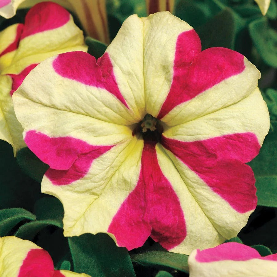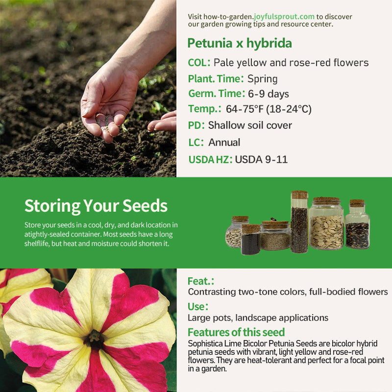 Sophistica Lime Bicolor Petunia Seeds is a high-end hybrid petunia variety featuring a contrasting two-toned color scheme. Its light yellow and rose-red flowers are highly recognizable among petunia varieties. The flowers are full, reaching up to 3 inches in diameter, with thick, textured petals that resist deformation. Compared to standard petunias, they are more heat-tolerant and can bloom normally and consistently in summer temperatures exceeding 30°C. Plants tend to stand upright.