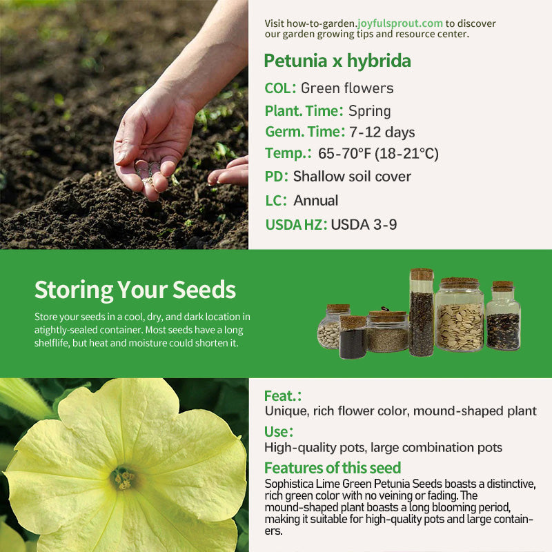 Sophistica Lime Green Petunia Seeds produce flowers with a unique, striking green color. The rich, even green color is free of the veining or fading common in traditional yellow petunias. The plant is mound-shaped, has a good growth habit, and reaches a moderate height. When in bloom, the flowers are abundant, belonging to the grandiflora type. Blooming continuously from spring to summer, the blooming period is long. This variety is well-suited to high-quality pots, large combination pots, and baskets. Its unique coloration earns it a premium retail price. It is highly adaptable and grows best in full sun with good drainage, making it a unique addition to gardens or interior decor.