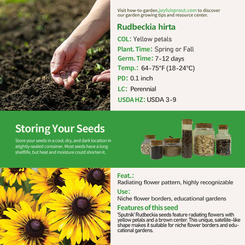 'Sputnik' Rudbeckia gets its name from its unique flower shape. Plants grown from seeds develop radiating flowers with slender, slightly curved petals, resembling the "solar panels" of a satellite. The main petals are yellow, while the center is dark brown, unlike the hemispherical center of common Rudbeckia. The flowers are approximately 3-4 inches in diameter, with a unique shape that makes them instantly recognizable. The plant grows approximately 28-34 inches tall, with a slender, upright stem and oblong, light green leaves. The plant maintains a loose yet dynamic growth. It prefers full sun, is drought-tolerant, and tolerates mild salinity, with a flowering period from summer to autumn.Special Offers: