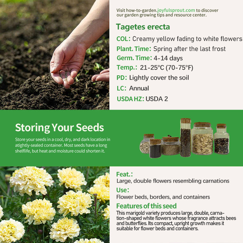 Sugar & Spice White Marigold Seeds produces annual plants that provide a delightful display from spring to fall. Its large, double, carnation-shaped flowers, borne singly or in clusters on sturdy stems, are fragrant and attract bees, butterflies, and hummingbirds. The flowers have a long vase life and can be dried for preserved bouquets. The plant has good branching, a compact, upright growth habit, and fragrant, finely lobed, pinnate leaves. It adapts to a wide range of soils and prefers full sun. While heat-tolerant, it benefits from some afternoon shade during hot summer months. It is often used in flower beds, borders, and containers, and is also effective in repelling garden pests.