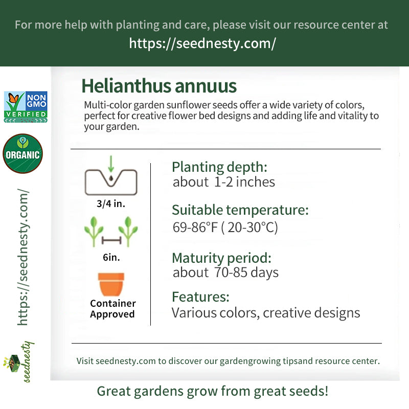 Multi-color garden sunflower seeds bloom in the sun, their rich and varied colors resembling nature's palette, a visual delight. Their unique appearance makes them ideal for creative flower bed designs, captivating countless eyes. Imagine admiring these beautiful sunflowers in your garden, feeling a surge of pride and wonder. Multi-color garden sunflowers are not only perfect for flower bed decoration, but also attract wildlife, adding life and vitality to your garden. Every time you see these flowers, you feel the power and beauty of nature, filling your life with vitality and inspiration.